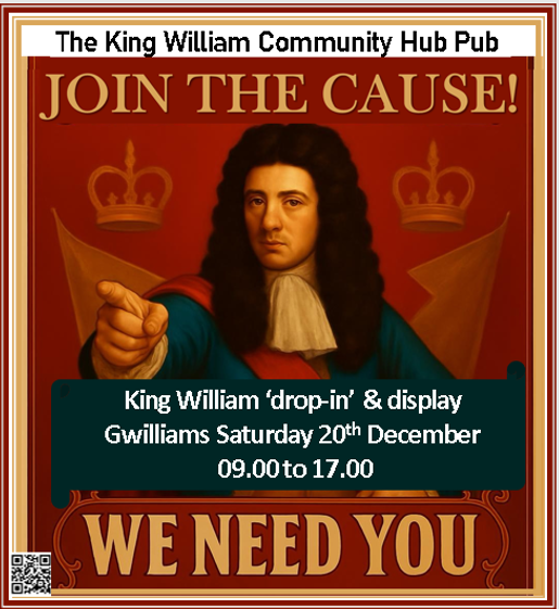 A King William ‘drop-in’ table top display will be at Gwilliams on Saturday 20th December 09.00 to 17.00